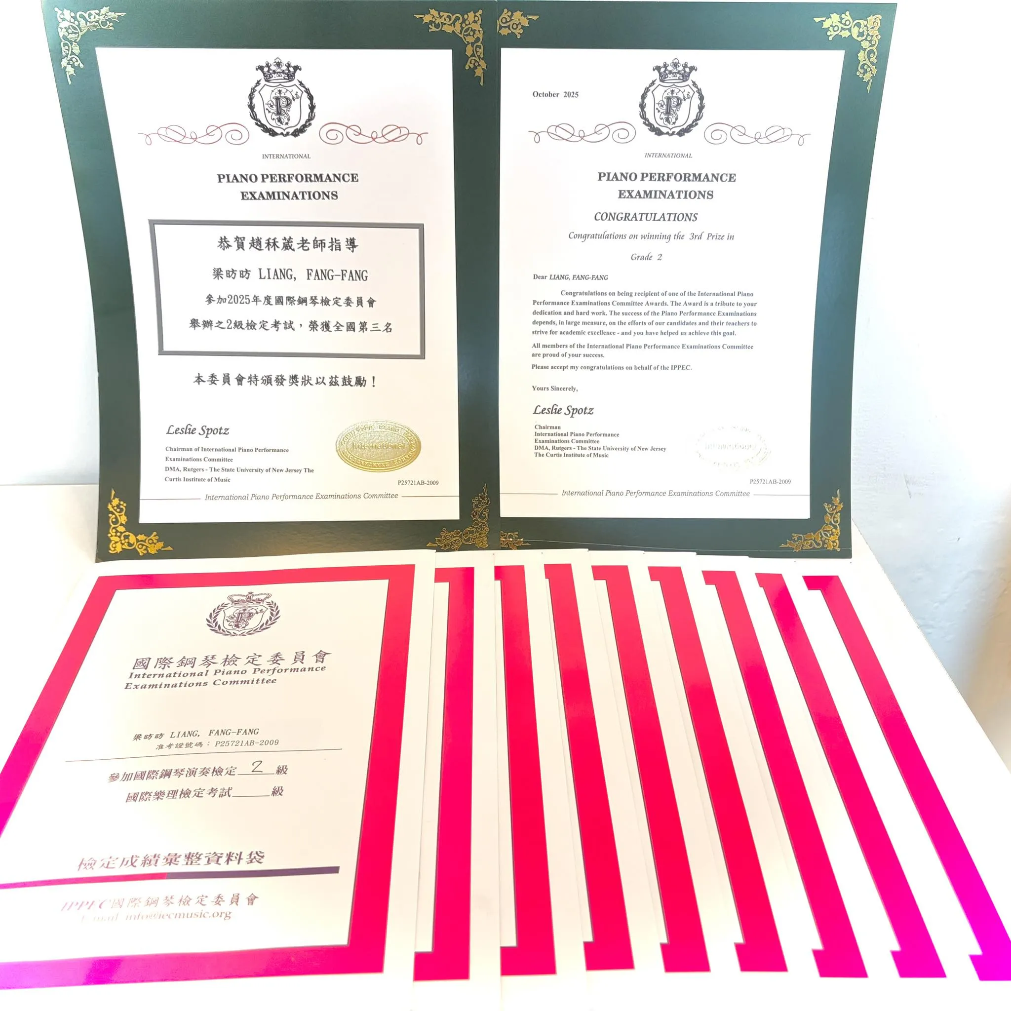 恭賀學生們參加IPPEC國際鋼琴檢定,所有學員都通過檢定,梁同學更是獲得2級組檢定全國第三名特優成績